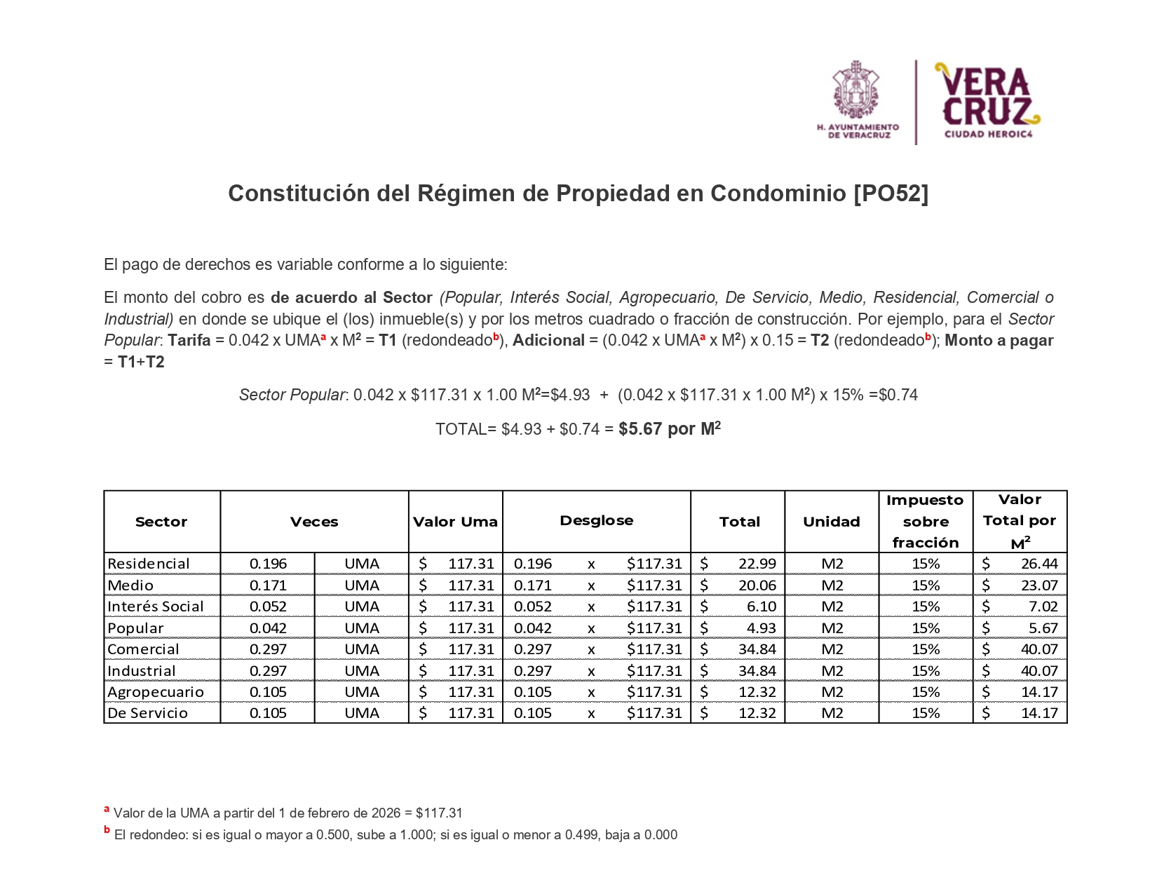 Cuando los diferentes pisos, departamentos, viviendas, locales, terrenos o naves de que conste un inmueble o que hubieran sido construidos en un predio con partes de uso común, sean susceptibles de adjudicarse a distintos propietarios; Cuando el propietario de un inmueble lo divida en diferentes pisos, departamentos, viviendas, locales, terrenos o naves, para enajenarlos a distintas personas y deje uno o varios elementos de uso y propiedad común indivisible; Cuando se establezca por disposición testamentaria, siempre que se ajuste a las normas de desarrollo urbano aplicables; Cuando se subdivida una copropiedad en dos o más unidades de propiedad exclusiva, que compartan en copropiedad bienes y áreas comunes; Cuando el inmueble construido en un lote familiar se divida en dos o más unidades de propiedad exclusiva y compartan en copropiedad bienes y áreas comunes; o Los propietarios de inmuebles con frente a vía pública obtengan la concesión para su uso exclusivo de las vías públicas. El pago de derechos es variable conforme a lo siguiente: SECTOR VECES UMA DESGLOSE TOTAL UNIDAD Residencial 0.196 UMA 0.196 x 117.31 $22.99 M2 Medio 0.171UMA 0.171 x 117.31 $20.06 M2 Interés Social 0.052UMA 0.052 x 117.31 $ 6.10 M2 Popular 0.042UMA 0.042 x 117.31 $ 4.93 M2 Comercial 0.297UMA 0.297 x 117.31 $34.84 M2 Industrial 0.297UMA 0.297 x 117.31 $34.84 M2 Agropecuario 0.105UMA 0.105 x 117.31 $12.32 M2 De Servicio 0.105UMA 0.105 x 117.31 $12.32 M2 Más el 15% adicional de acuerdo con el artículo 172, fracción III del Código Hacendario para el Municipio de Veracruz.