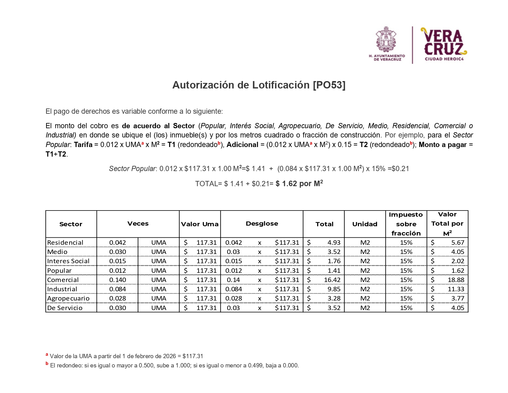 Se otorgara la lotificación cuando el parcelamiento propuesto por el solicitante, previa verificación de que el mismo cumple con la densidad, tamaño de lotes y demás especificaciones señaladas por tipo de fraccionamiento, y el inicio de obra de urbanización consistente en: Limpieza del terreno, trazo y nivelación de vialidades y conformación de plataformas. El pago de derechos es variante de acuerdo a lo siguiente: DERECHO SECTOR VECES UMA DESGLOSE TOTAL UNIDAD Lotificación Residencial 0.042 UMA 0.042 x 117.31 $ 4.93 M2 Medio 0.030 UMA 0.030 x 117.31 $ 3.52 M2 Interés Social 0.015 UMA 0.015 x 117.31 $ 1.76 M2 Popular 0.012 UMA 0.012 x 117.31 $ 1.41 M2 Comercial 0.140 UMA 0.140 x 117.31 $16.42 M2 Industrial 0.084 UMA 0.084 x 117.31 $ 9.85 M2 Agropecuario 0.028 UMA 0.028 x 117.31 $ 3.28 M2 De servicio 0.030 UMA 0.030 x 117.31 $ 3.52 M2 Más el 15% adicional de acuerdo con el artículo 172, fracción III del Código Hacendario para el Municipio de Veracruz.