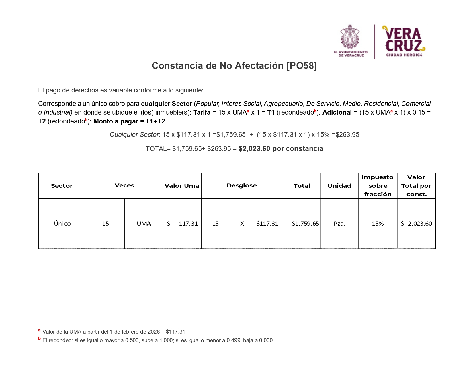 La constancia se otorgará siempre y cuando el proyecto que se presente cumpla con los lineamientos del Programa de Desarrollo Urbano y con la normativa vigente. SECTOR VECES UMA DESGLOSE TOTAL UNIDAD Interés social 15 UMA 15 x 117.31 $1,759.65 M2 Popular 15 UMA 15 x 117.31 $1,759.65 M2 Residencial 15 UMA 15 x 117.31 $1,759.65 M2 Industrial 15 UMA 15 x 117.31 $1,759.65 M2 Comercial 15 UMA 15 x 117.31 $1,759.65 M2 Medio 15 UMA 15 x 117.31 $1,759.65 M2 Agropecuario 15 UMA 15 x 117.31 $1,759.65 M2 De Servicio 15 UMA 15 x 117.31 $1,759.65 M2